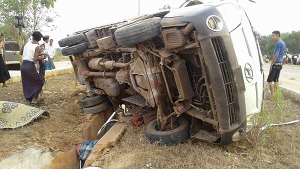 ကားေမာက္သြားျပီး ၅ ေယာက္ေသ ၅ ေယာက္ထိခိုက္ဒဏ္ရာရခဲ့ပါတယ္။ ဒဏ္ရာရသူမ်ားကို ေနျပည္ေတာ္ ကုတင္ ၁၀၀၀ ေဆးရံုသို႔ ပို႔ေဆာင္ထားခဲ့သည္။