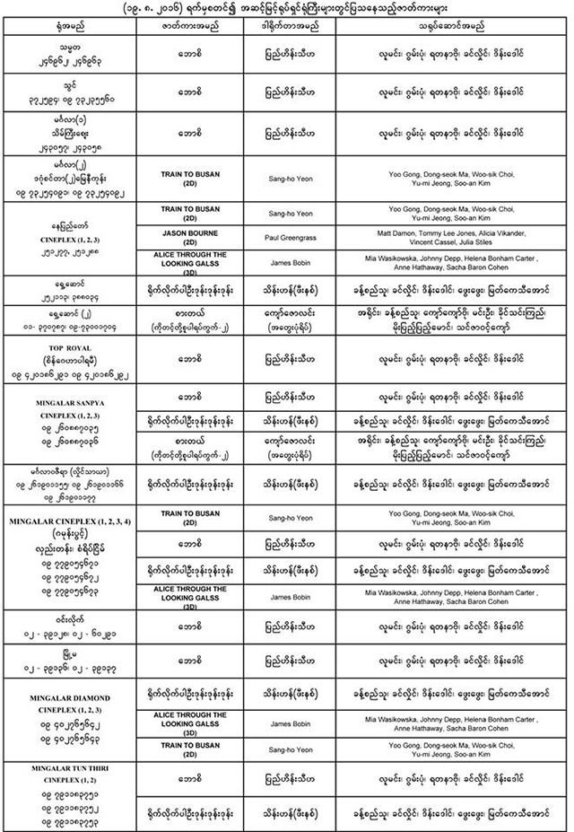 ရန္ကုန္ Mingalar Cineplex. ဂမုန္းပြင့္ (လွည္းတန္း-စံရိပ္ၿငိမ္) - သမၼတ - သြင္ - မဂၤလာ(သိမ္ႀကီးေစ်း) - မဂၤလာစံျပ - Top Royal ပါရမီ စိန္ေဂဟာ - မႏၱေလး ၀င္းလိုက္ - ၿမိဳ႕မ - ျပည္ - မဂၤလာထြန္းသီရိ - လားရႈိး - ေအာင္သီရိ -